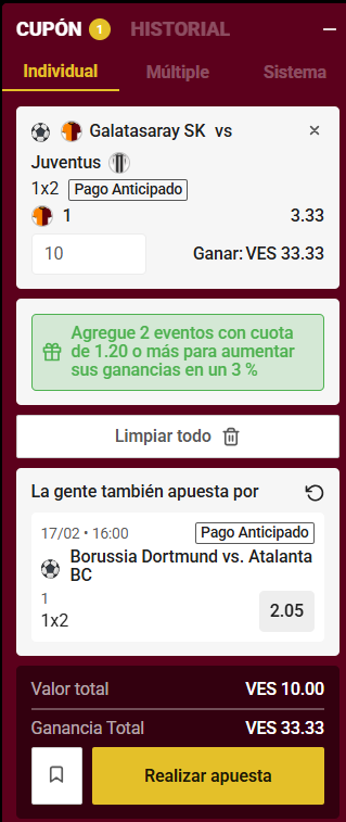 La oferta es válida para apuestas simples, múltiples, de sistema y de creación de apuestas realizadas en el mercado 1X2 (Ganador local o visitante) ÚNICAMENTE antes del inicio del partido y no durante el partido. La oferta no se aplica a las apuestas realizadas en la selección del sorteo en cada juego.