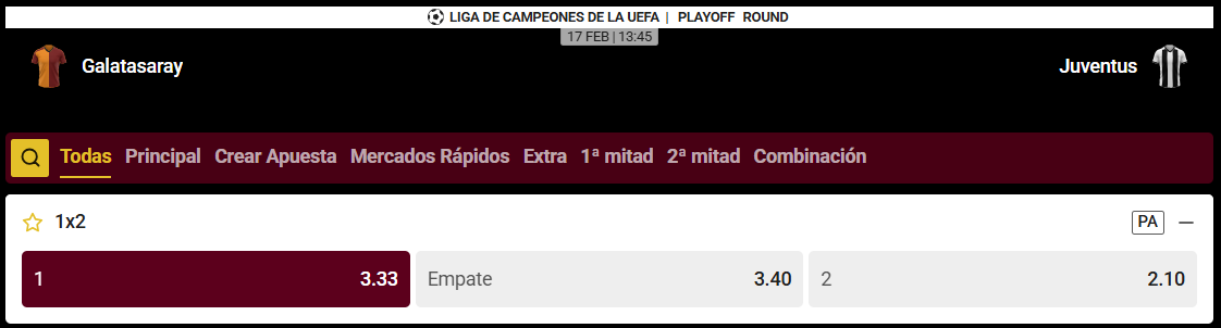 Las apuestas se colocan en el mercado 1x2.En algún momento, Juventus durante el juego Juventus lidera 2-0.